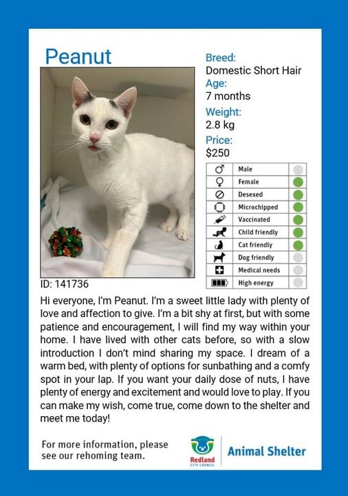 Meet Peanut. A sweet 7-month-old white Domestic Short Hair girl at the Redland City Council Animal Shelter. Looking for her perfect forever home.