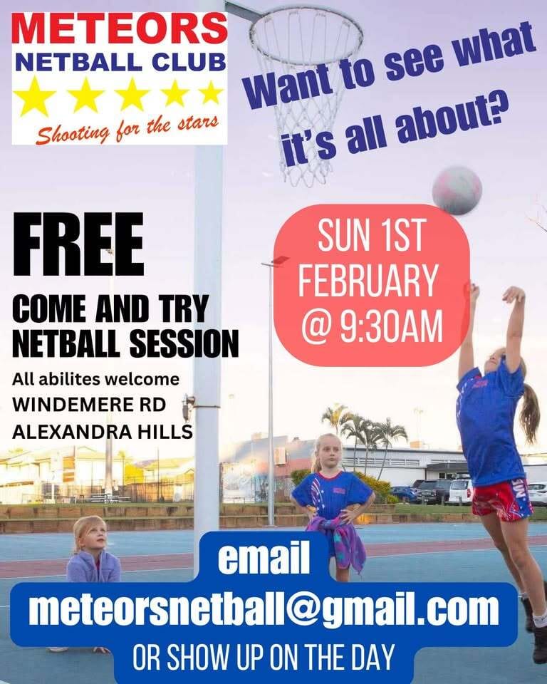 Curious about netball? Come along and give it a go with the Meteors in Alexandra Hills. It’s relaxed, friendly, and perfect for beginners. Just bring a water bottle and comfy activewear.